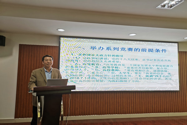 中华优秀传统文化系列竞赛,是由人文学院主办、文化传播系承办的校级竞赛活动;自2018年开始,每年举办两季(上半年、下半年)四个场次的赛事。崔教授从“举办系列竞赛的前提条件”、“举办系列竞赛的具体过程”、“举办竞赛的初步成效”三个方面,详细介绍了“传统文化系列竞赛”的有关情况。同时,还分别以“具备牢固基础、明确目标定位、严密组织实施、坚持守正出新、获取支持扶助”为题,与大家分享了主持举办此项系列竞赛活动的体会。