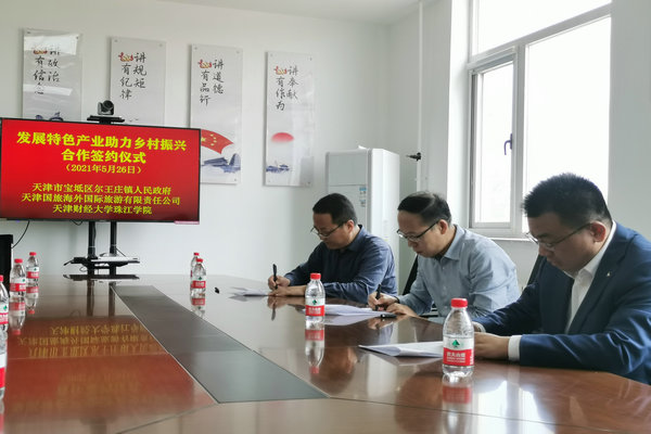 为扎实推进结对帮扶工作与乡村振兴有效衔接,发挥特色产业在促进乡村振兴中的积极作用,2021年5月26日下午,在宝坻区尔王庄镇政府,我院与天津市宝坻区尔王庄镇人民政府、天津国旅海外国际旅游有限责任公司签订了“发展特色产业助力乡村振兴战略实施合作框架协议”。