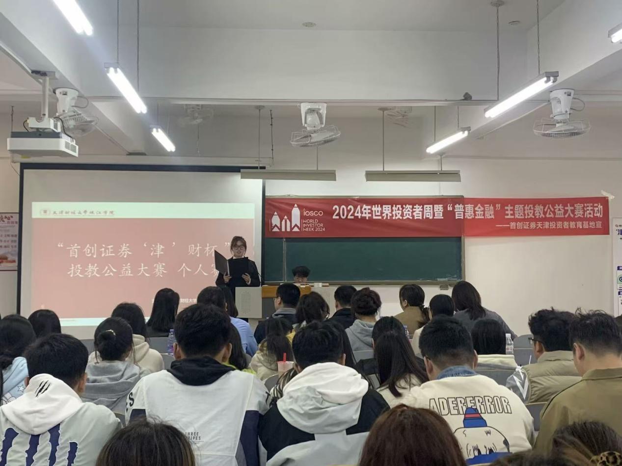 10月23日下午,王丽娜名师工作室携手首创证券在新上善楼203教室共同举办了“津”财杯投资公益大赛。大赛评委团由《天津资本市场》主编高玥、首创证券高级投资者顾问、天津经济广播《今日证券》常驻嘉宾纪旭、首创证券投教基地产品部总监赵雪、高级投资顾问赵小龙、天津投教基地负责人李健蕊和经济学院5名教师担任。我院46名学生积极参赛,100余名学生现场观摩学习。
