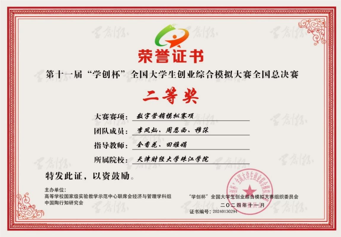 “学创杯”全国大学生创业综合模拟大赛由高等学校国家级实验教学示范中心联席会经管学科组、中国陶行知研究会联合主办,是入选中国高等教育学会全国普通高校竞赛榜单的国家级高水平管理类学科竞赛,已持续举办十一届。本届大赛吸引了来自武汉大学、中山大学、吉林大学等1500多所高校学生参加。从2024年1月开始,管理学院成立专业指导团队,组织了20支队伍、共60名学生参加校赛,在备赛中坚持贯彻“课赛融合”的理念,将竞赛与课程教学、人才培养紧密结合。历经校赛、省赛、全国半决赛、总决赛层层选拔,最终获得佳绩。