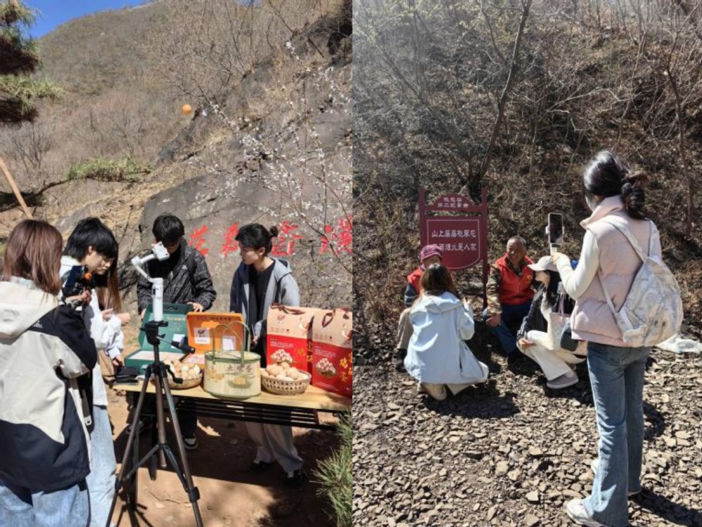 活动期间,“麻酱拌香菜”和“禾作hi~”两个学生创业团队以桃花诗会和新水场村鸡蛋产业为主题,开展近120分钟的现场助农直播。直播吸引300余位观众在线互动,收获8500+点赞,成功为当地农产品打开数字化销售渠道。这场直播不仅传播了桃花诗会的热闹氛围,更通过新媒体技术将乡村经济与消费者需求直接对接,探索出“内容传播+电商带货”的乡村振兴新模式。除直播外,其他同学分组创作短视频和互动H5作品。他们用镜头捕捉桃花娇艳、活动精彩瞬间以及乡村自然人文风光,形成一系列具有传播价值的数字内容。优秀作品将被推荐至主流媒体平台,为蓟州乡村文旅打造可持续传播的数字资产,突破传统旅游营销的时间空间限制。