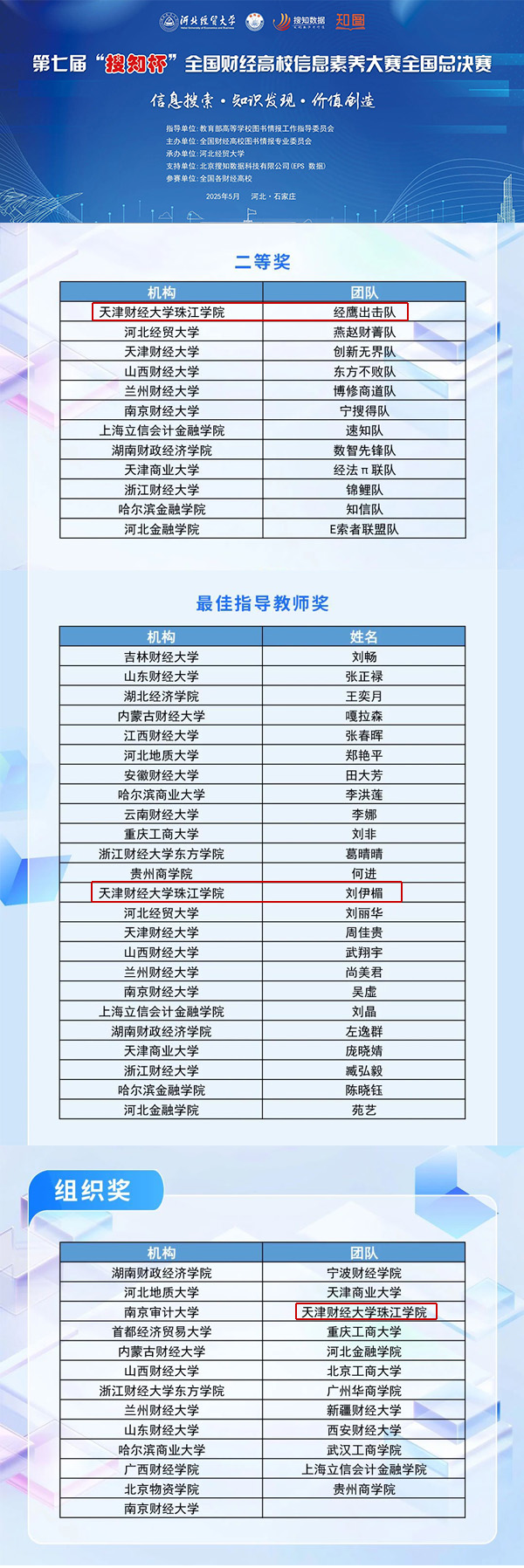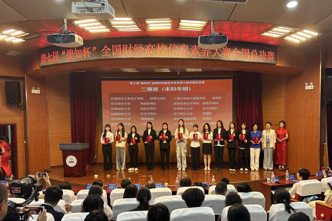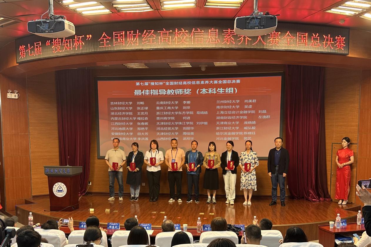 5月18日,第七届“搜知杯”全国财经高校信息素养大赛总决赛在河北经贸大学圆满落幕。我院参赛团队凭借扎实的专业素养和出色的综合能力,在全国39所财经高校61支参赛队伍中脱颖而出,荣获全国总决赛本科生组二等奖,创历史最佳成绩,副馆长陈隽宜带领的图书馆指导教师团队获最佳指导教师奖和组织奖,这充分展现了图书馆在信息素养教育与创新人才培养方面的喜人成果。