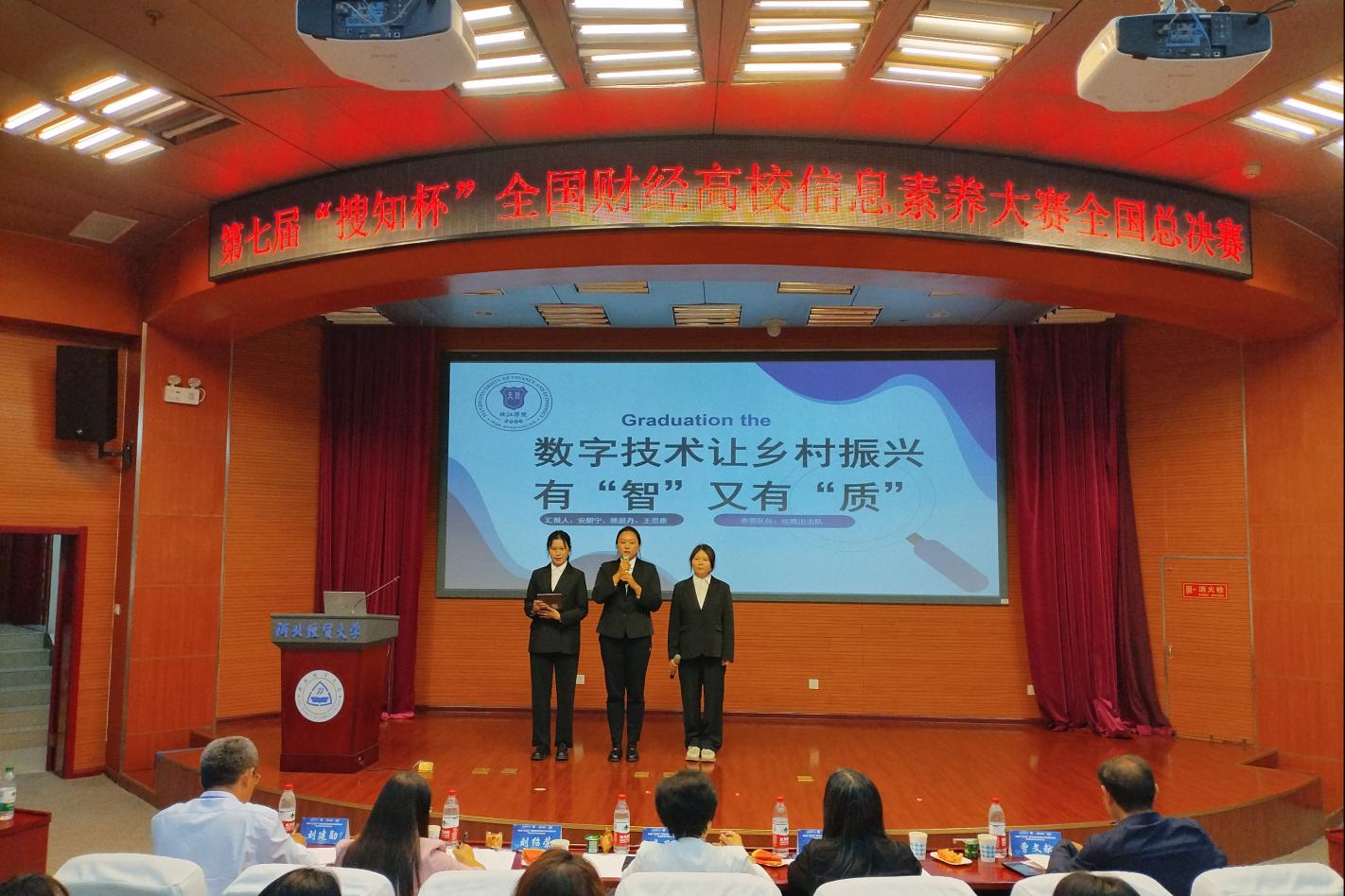 本届赛事共吸引了全国43所财经高校的近13000名师生参与。3月伊始,图书馆组织学院288名同学经过校级初赛、复赛的层层选拔,由管理学院安麒凝、王思雅、经济学院熊晨丹三名同学组成的“经鹰突击队”代表学校晋级全国总决赛。在总决赛中,团队通过“信息素养知识考试”“检索分析与方案设计”“现场汇报”等环节的激烈角逐,最终以“数字技术让乡村振兴有‘智’更有‘质’”为汇报题目,以AI情景问答的形式将报告串联,凭借精准的信息处理能力、创新的汇报形式和默契的团队协作,赢得了评委的普遍认可。