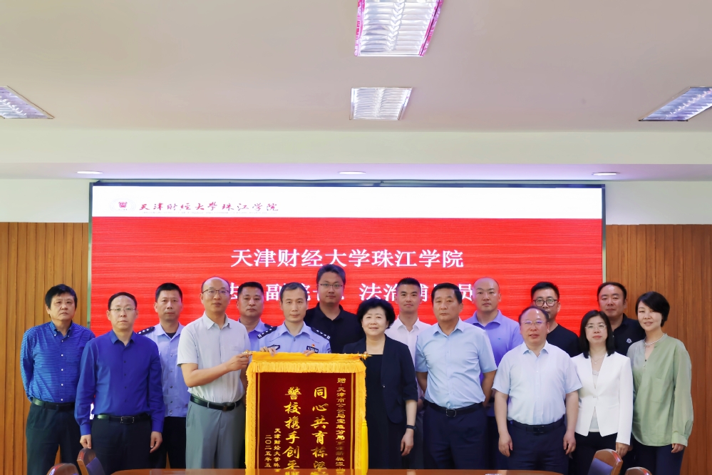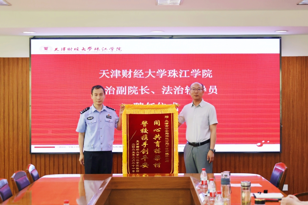 党委书记梁海龙向京津新城派出所赠送题有“同心共育栋梁材,警校携手创平安”的锦旗,以此表达学院对派出所长期以来维护校园安全稳定、保障师生权益的诚挚谢意。院长任碧云教授向李立军所长颁发法治副院长聘书,向张建斌警官、李瑞红警官颁发法治辅导员聘书。聘任仪式庄重肃穆,现场掌声热烈,充分体现了学院对法治教育工作的高度重视,以及深化校警合作、推进依法治校的坚定决心。