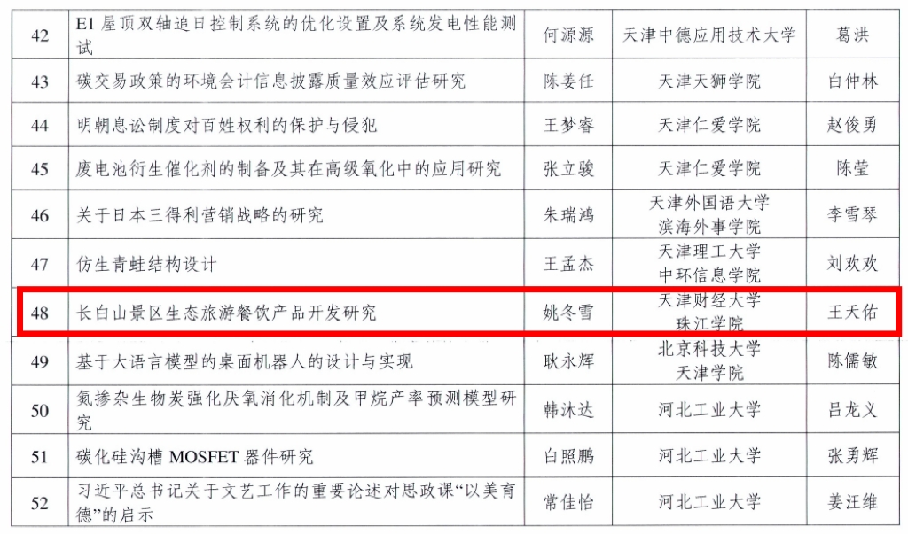 近日,天津市教育委员会公布第十五届天津市级本科生优秀毕业设计(论文)评选名单,我院管理学院姚冬雪同学的毕业设计(论文)《长白山景区生态旅游餐饮产品开发研究》获评市级优秀毕业设计(论文)。该论文由王天佑老师指导完成。