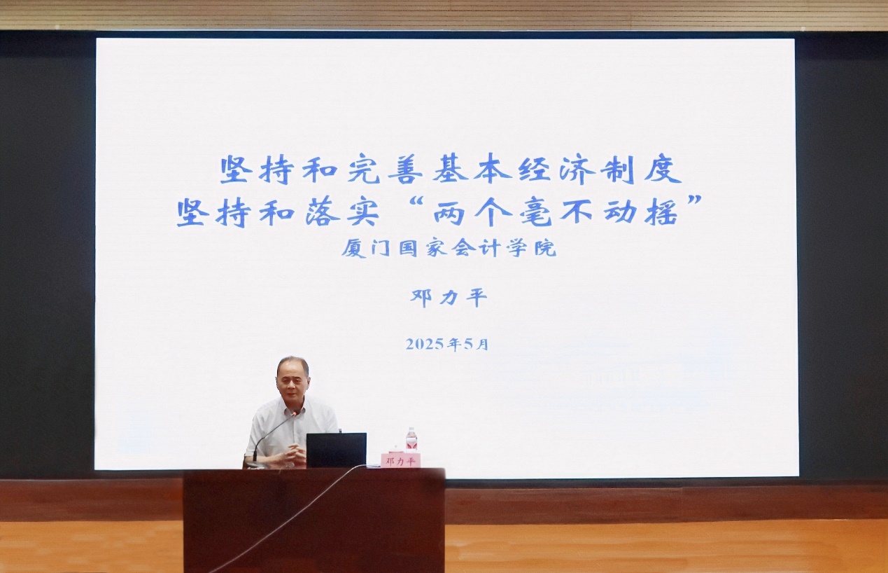 5月28日,厦门国家会计学院中国特色社会主义财税研究中心主任邓力平教授应邀为学院师生作题为“坚持和完善基本经济制度,坚持和落实‘两个毫不动摇’”的学术报告。学院领导任碧云、梁海龙、李晓鹏、李金山、陈明明、郭鑫出席活动,经济学院两百余名师生现场聆听。报告会在弘毅楼报告厅举行,由经济学院院长李志辉教授主持。