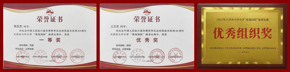 在纪念中国人民抗日战争暨世界反法西斯战争胜利80周年之际,由天津市教育委员会、中共天津市委宣传部、天津警备区政治工作局及动员局联合主办的2025年天津市大中小学“爱我国防”主题演讲比赛自2025年3月启动以来,吸引了1.56万名学生参加,覆盖全市460余所大中小学。比赛共分成小学组、初中组、高中组、高职在校大学生组、高职退役大学生组、高教在校大学生组、高教退役大学生组7个组别。经过校级选拔、初赛评审的层层筛选,每个组别全市前10名选手参加决赛,我院两名学子分别晋级高教在校大学生组和退役大学生组决赛并最终斩获佳绩。