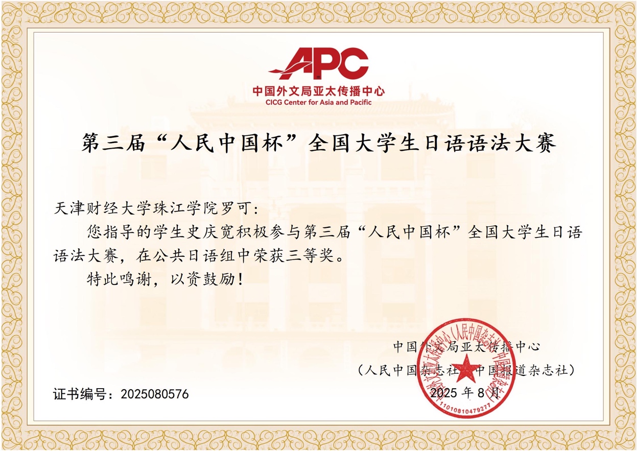 近日,第三届“人民中国杯”全国大学生日语语法大赛圆满落幕,人文学院传播2401班史庆宽、视传2403班唐大鑫同学,在日语教研室罗可老师的悉心指导下,荣获大赛公共日语组三等奖。