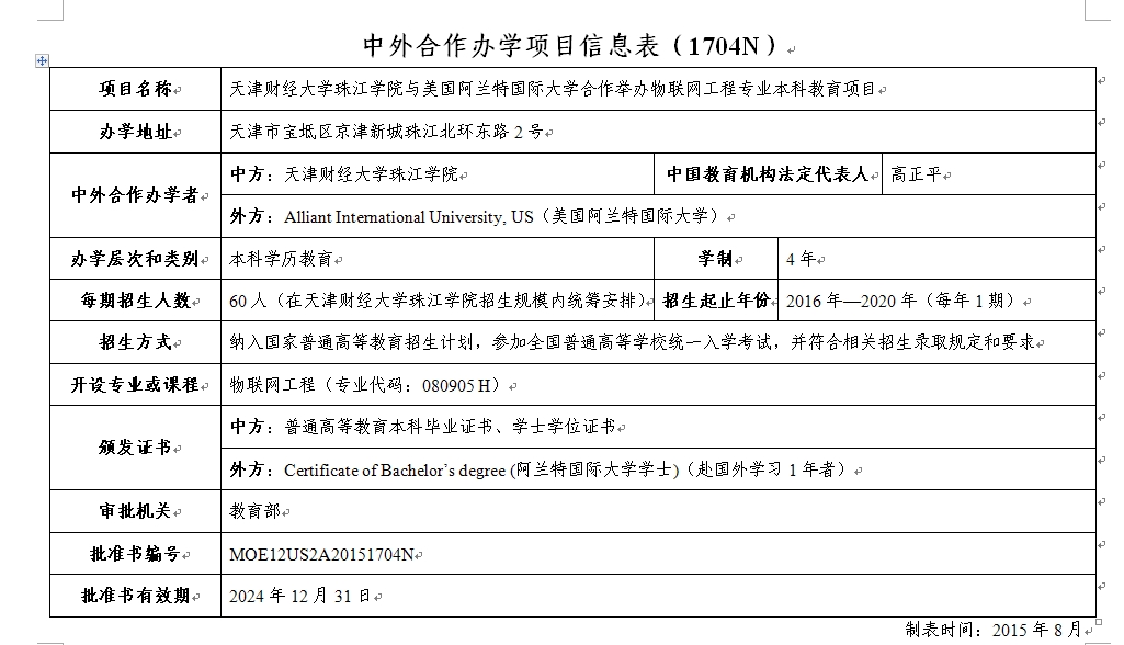 学院与美国阿兰特国际大学合作举办的物联网工程专业本科教育项目,纳入国家普通高等教育招生计划,将于2016年招生。该项目为“3+1”模式,即前三年在365英国上市集团官网学习,第四年赴阿兰特国际大学就读,毕业颁发中外双方学位。
