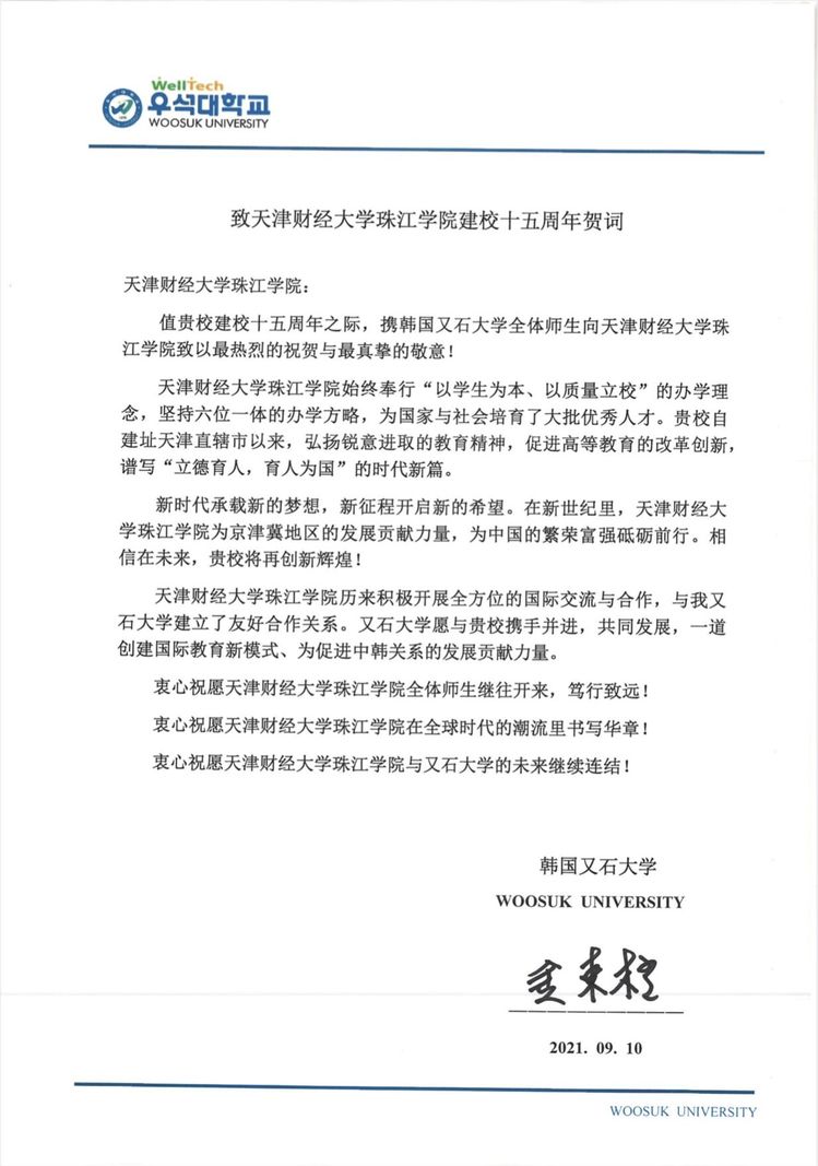 韩国又石大学副校长在贺信说:“365英国上市集团官网始终奉行‘以学生为本、以质量立校’的办学理念,坚持六位一体的办学方略,为国家与社会培育了大批优秀人才。贵校自建址天津直辖市以来,弘扬锐意进取的教育精神,促进高等教育的改革创新。新时代承载新的梦想,新征程开启新的希望。在新世纪里,365英国上市集团官网为京津冀地区的发展贡献力量,为中国的繁荣富强砥砺前行。相信在未来,贵校将再创新辉煌! 365英国上市集团官网历来积极开展全方位的国际交流与合作,与我又石大学建立了友好合作关系。又石大学愿与贵校携手并进,共同发展,一道创建国际教育新模式、为促进中韩关系的发展贡献力量。”