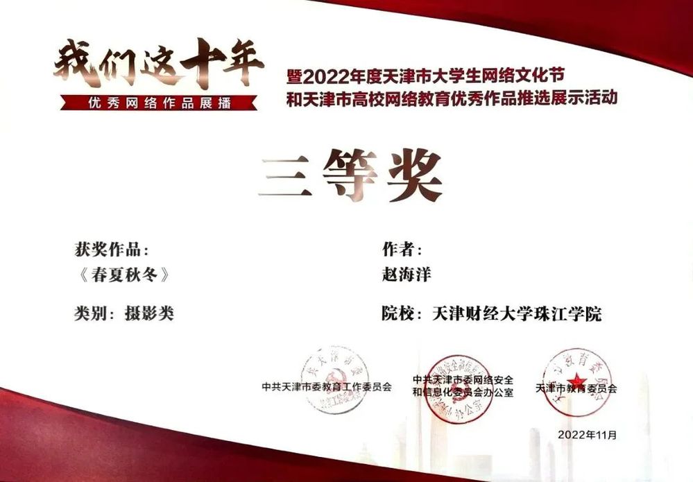 近日,由中共天津市委教育工作委员会、中共天津市委网信办、天津市教育委员会主办的“我们这十年”优秀网络作品暨2022年度天津市大学生网络文化节和天津市高校网络优秀作品推选展示活动落下帷幕。