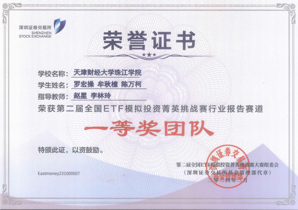 “千磨万击还坚劲,任尔东西南北风”。在指导老师赵星和李林玲老师的悉心指导下,我校在“全国第二届模拟投资精英挑战赛(行业报告赛道)”中成功斩获“一等奖团队”,并获深交所邀请,参加2024年3月5日于深圳市·深交所大楼举行的决赛,荣获第六名佳绩。