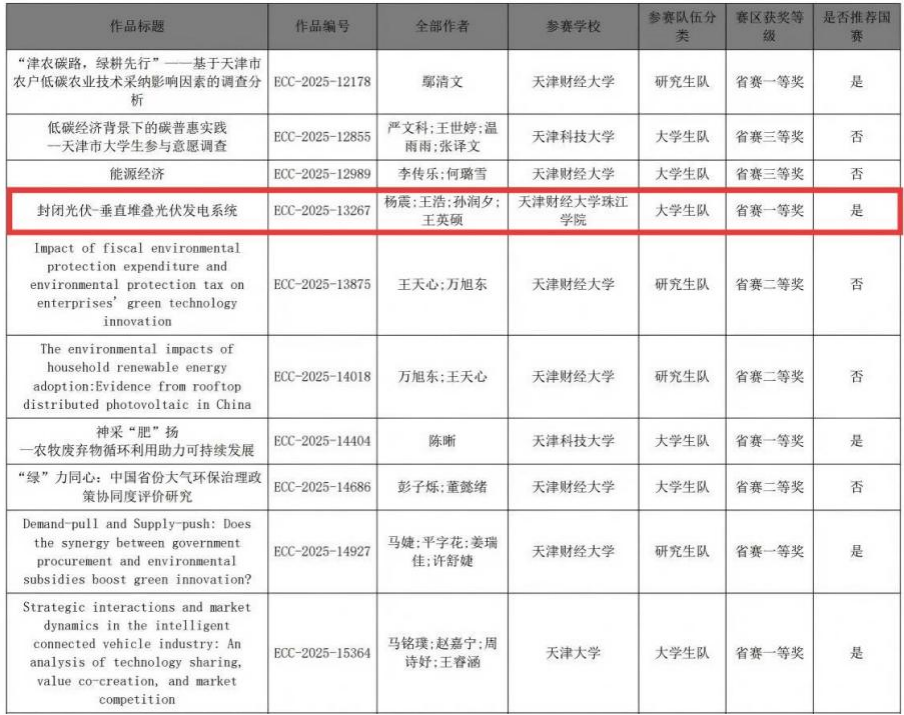 近日,在第十一届全国大学生能源经济学术创意大赛天津赛区中,我院学子脱颖而出,斩获佳绩!我院杨震、王浩、孙润夕、王英硕四位同学凭借“封闭光伏——垂直堆叠光伏发电系统”作品,以出色的表现荣获大赛一等奖,为学院在能源经济学术研究领域书写下精彩篇章!