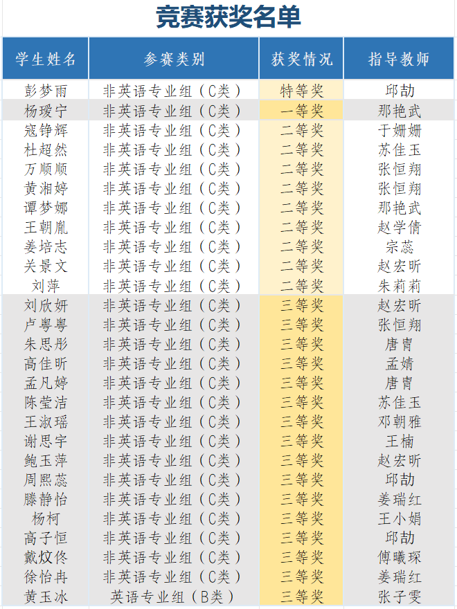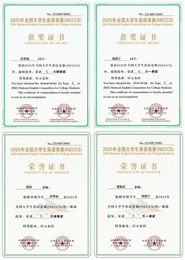 近日,2025年全国大学生英语竞赛决赛在圆满落幕。珠江学子不负众望,凭借扎实的专业功底和出色的赛场发挥,取得了令人瞩目的优异成绩。会计 2202 班彭梦雨首次夺得非英语专业本科组C类特等奖,实现了学院在该项赛事中的历史性突破。同时,学院另有1人荣获一等奖,9人荣获二等奖,16人荣获三等奖,充分展示了学院英语教学的扎实基础和有效性。
