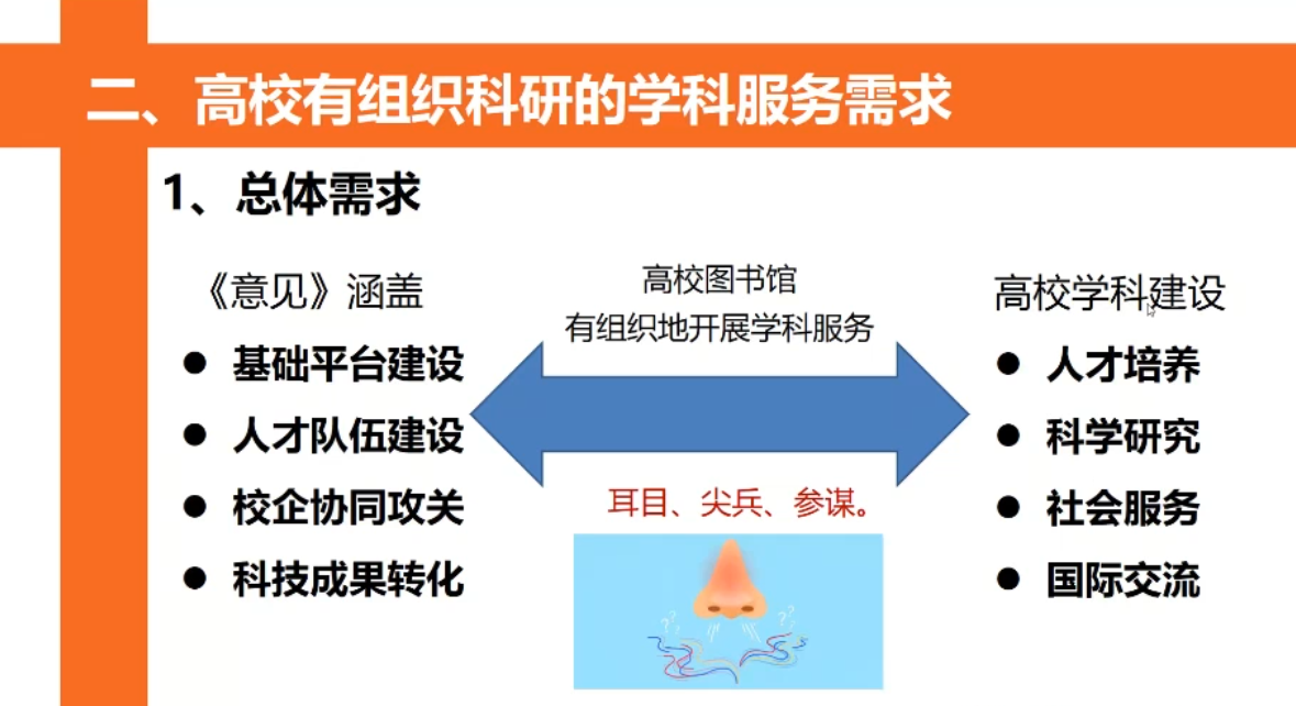 此次培训的主题为“有组织科研下的图书馆学科服务创新”。此次培训主要讲解了有组织科研的内涵、高校有组织科研的学科服务需求、高校图书馆学科服务新举措、有组织科研背景下学科服务的嵌入。