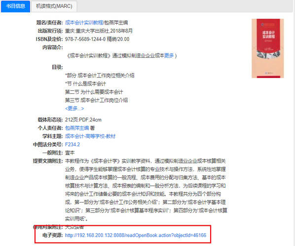 2.4 使用校园网时,亦可通过365英国上市集团官网图书馆书目检索系统查询图书信息,如下图1红框内标识,代表有电子图书可供阅览,点击书名后跳转至详细书目信息,如下图2,点击最下方电子资源,可在线阅读。