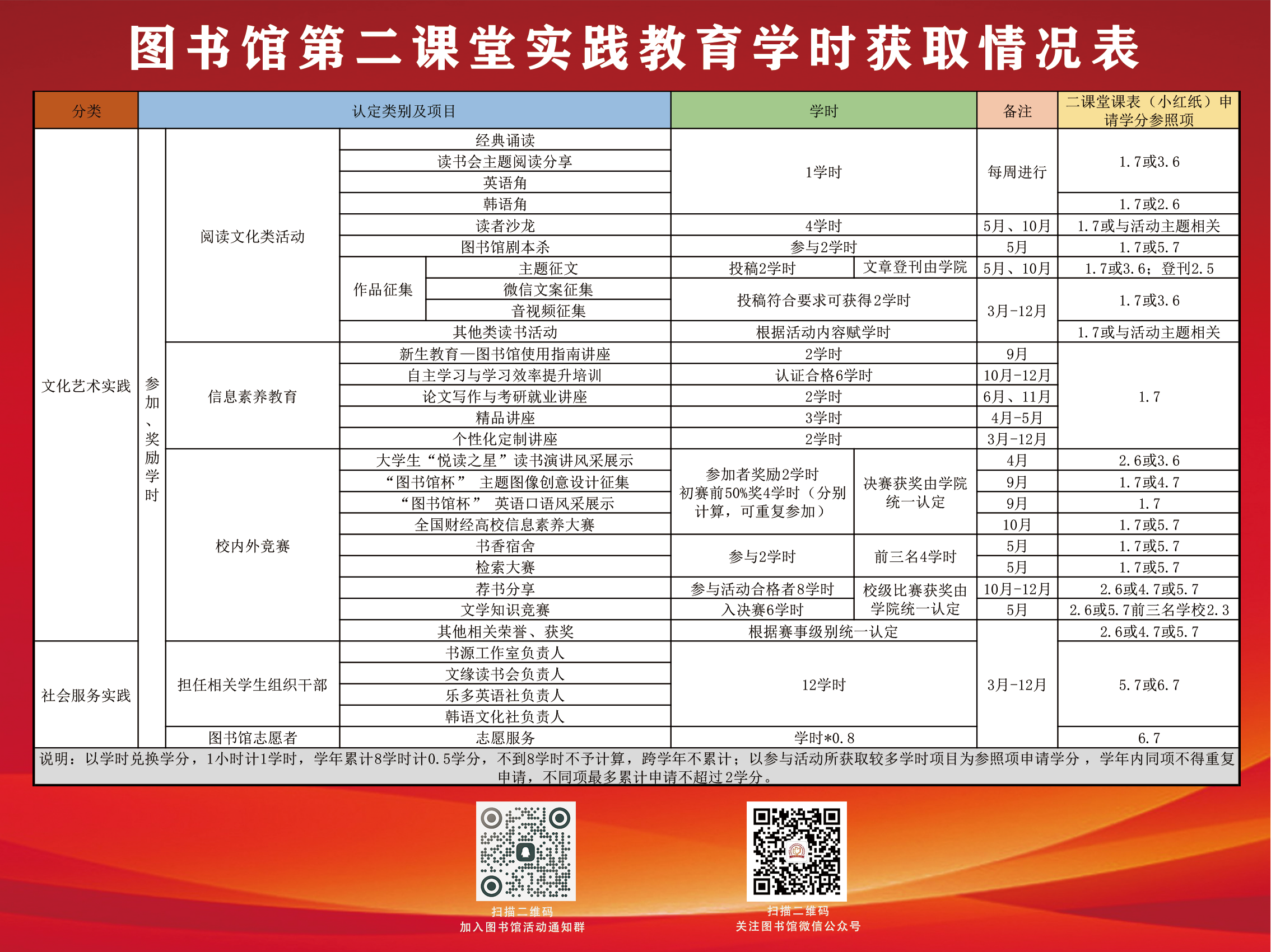 3.考核方式为线上考核,可通过扫码进入答题页面完成答题。参与考核的学生须提交个人真实信息,方便后台统计成绩,成绩达标可获得图书馆第二课堂实践教育2学时,参与活动累计8学时可兑换0.5学分,详情请参考学时获取情况表。答题方式通过在图书馆微信公众号对话框中输入“新生教育考核”获取二维码,扫码答题(请10月8日开始操作)。