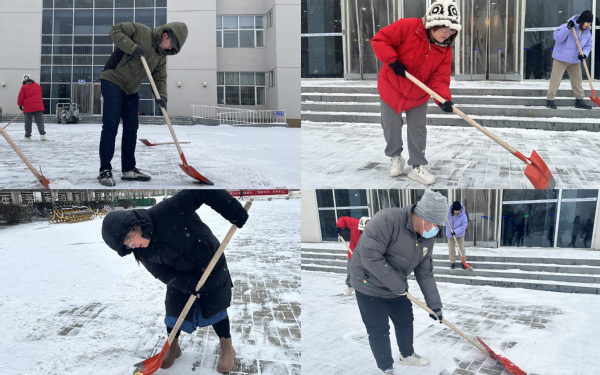 厚重的冰雪给清理工作带来困难,但大家不畏辛苦,干劲十足,相互配合,齐心协力。经过几个小时的清理,图书馆门前扫出一条宽敞的道路,为师生进出图书馆提供便利。