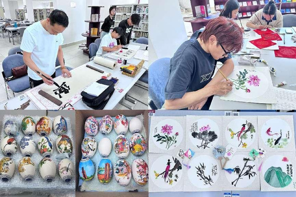 活动开始,书法名家张华老师结合自身经历介绍了书法运笔与构图经验。宝坻区非遗传承人刘宝明老师为大家展示了自己精心制作的彩绘蛋壳艺术作品。学生代表也与专家交流分享了书画学习艰辛历程和收获。而后,两位老师现场进行了书画创作,同学们也体验了书写绘制对联、书签、竹扇等作品的过程,老师对部分学生作品进行了点评。