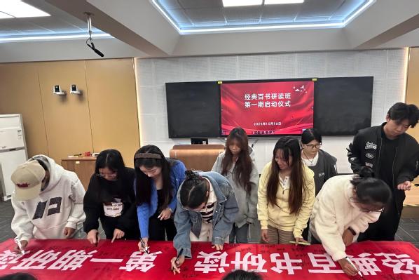 为深化学院“1+6+3”人才培养体系,培养学生跨学科思维、提升学生文化底蕴和思辨能力,图书馆于10月16日在日新楼206室举办经典百书研读班第一期启动仪式。图书馆馆长鲍晓悦、副馆长陈隽宜、图书馆各部门辅导老师及研读班第一期报名学生59人出席并参与了此次活动。