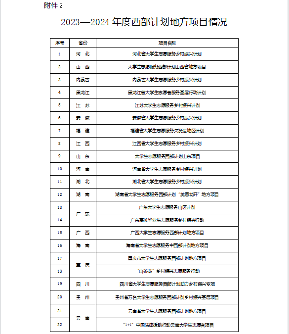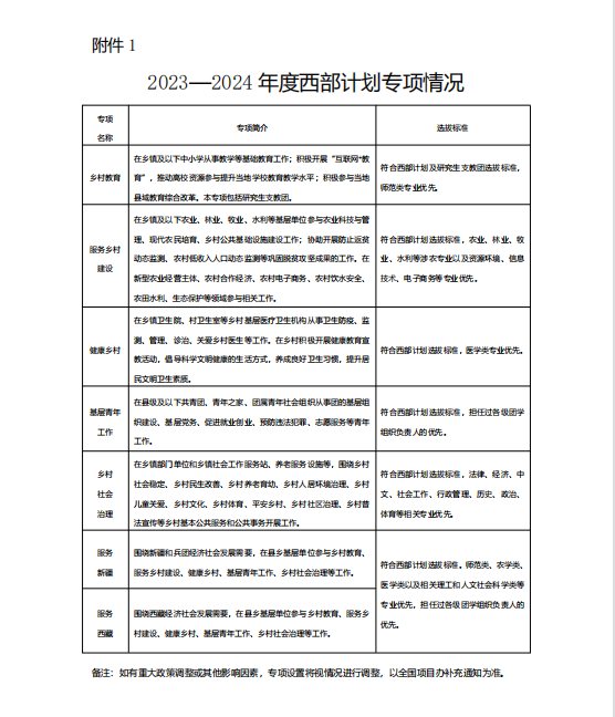 2023—2024年度西部计划紧紧围绕接续全面推进乡村振兴战略的有关部署,实施乡村教育、服务乡村建设、健康乡村、基层青年工作、乡村社会治理、服务新疆、服务西藏7个专项(见附件1)。岗位设置严格落实基层导向、乡村导向,重点向国家乡村振兴重点帮扶县、当地乡村振兴重点帮扶县的乡村、易地扶贫搬迁安置社区、全国乡村治理示范村镇、全国乡村振兴科技引领示范村镇调整。巩固和扩大民族地区、边疆地区、革命老区的实施规模,助力培养和输送青年人才。巩固乡村教育专项规模,助力提升乡村教育实效。扩大服务乡村建设、健康乡村、乡村社会治理专项规模。进一步鼓励和支持服务期满志愿者扎根当地,持续深化优秀人才跟踪培养。以青年马克思主义者培养工程(以下简称“青马工程”)西部计划专项和研究生支教团专项为抓手,进一步凸显西部计划实践育人的功能,凸显西部计划的志愿性,搭建助力志愿者在实践中坚定理想信念、站稳人民立场、厚植家国情怀、练就过硬本领、投身强国伟业的平台。今,天津市将继续拓宽志愿者派出的口径,在做好对口服务新疆、西藏、甘肃等省份的基础上,积极与其他服务省份沟通协商地方项目(附件2)志愿者派出事宜,不断提高西部计划志愿者选派工作质量。