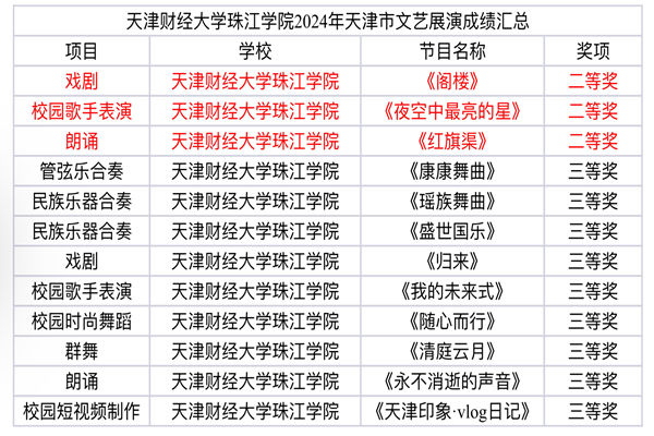 大学生艺术团选送的戏剧《阁楼》、校园歌手表演《夜空中最亮的星》、朗诵《红旗渠》荣获天津市二等奖。