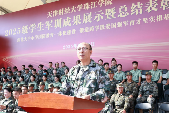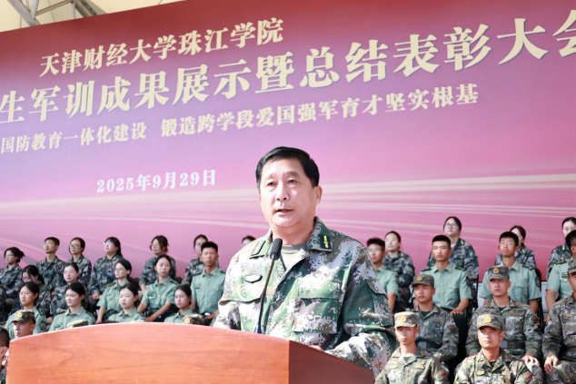 院长任碧云教授作题为《弘扬军训精神 磨砺青春意志》军训总结报告。她代表学院欢迎领导、来宾和家长朋友们出席军训成果展示暨总结表彰大会,祝贺2025级同学们顺利完成了大学的第一堂必修课,感谢天津市委宣传部、天津市教委、宝坻区人武部、宝坻区教育局对学院国防教育事业给予的支持和帮助,对帮训部队官兵和学生教导队承训教官的辛苦付出给予高度赞扬。她对精彩纷呈、卓有成效的军训成果感到欣慰和喜悦,为同学们展示出的军事素养和精神面貌感到骄傲和自豪。她希望同学们在书山学海中,以站军姿的恒心攻克难题;在人生征途上,以踢正步的坚定迈向理想;在时代洪流里,将“勤学善思”化为个人智慧,以“厚德笃志”成就集体荣光。在纪念中国人民抗日战争暨世界反法西斯战争胜利80周年、喜迎中华人民共和国76周年华诞的重要时刻,任院长提出:一、向军人的好品格致敬,把他们的优良作风传承下去。希望同学们学习军人能吃苦、肯奋斗、爱国家、敢拼搏的好品质,继续努力、追求更好,把军训时养成的好习惯和锻炼出的坚强意志用到以后的学习生活里,时刻展现新时代大学生有活力、肯向上的好风貌。二、向伟大的祖国致敬,在心里深深种下爱国的情感。希望同学们把爱国变成自己一辈子的底色,遵守学校规定、爱护校园,尊重老师、关心同学,孝顺父母、真诚待人,努力学习、练强本领,分清对错、传播正能量,争取成长成能担起民族复兴重任的有用人才。三、向美好的青春致敬,永远保持忠诚的初心。希望同学们坚定自己的信念、珍惜宝贵的时光,记住学习的初衷、练就过硬的本领、打造更优秀的自己,把青春的理想种在民族复兴的土地上,把奋斗的脚印留在建设社会主义现代化强国的路上,努力做热爱祖国、立志报国、踏实做事的新时代青年,用军人般的坚强、青春的热情为伟大的祖国献礼。