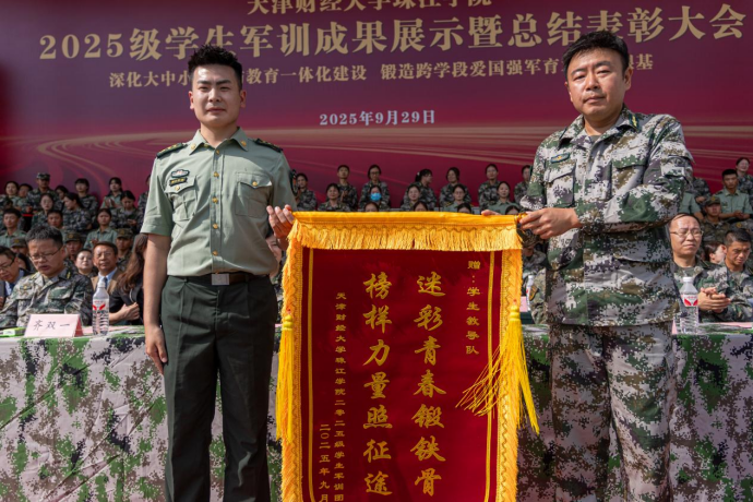 院长助理郭鑫向学生教导队承训教官赠送了锦旗,党委书记梁海龙向帮训部队赠送锦旗,感谢他们在军训期间的辛勤付出和耐心指导。