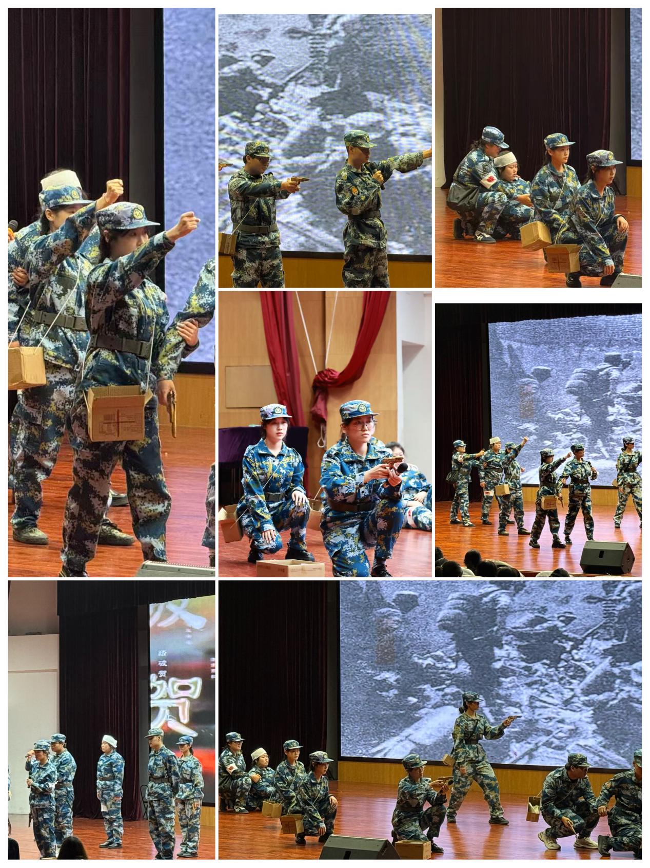 管理学院《墙上的弹孔》聚焦台儿庄惨烈巷战,彰显了中国军人的无畏牺牲;会计学院《东风承魂》则以跨越百年的叙事,深刻诠释了民族精神的代代传承。表演间隙,大学生军人服务中心深情献唱《铭记》,将沉重的岁月化作动人音符,深切致敬不屈过往,抚慰不朽英灵。