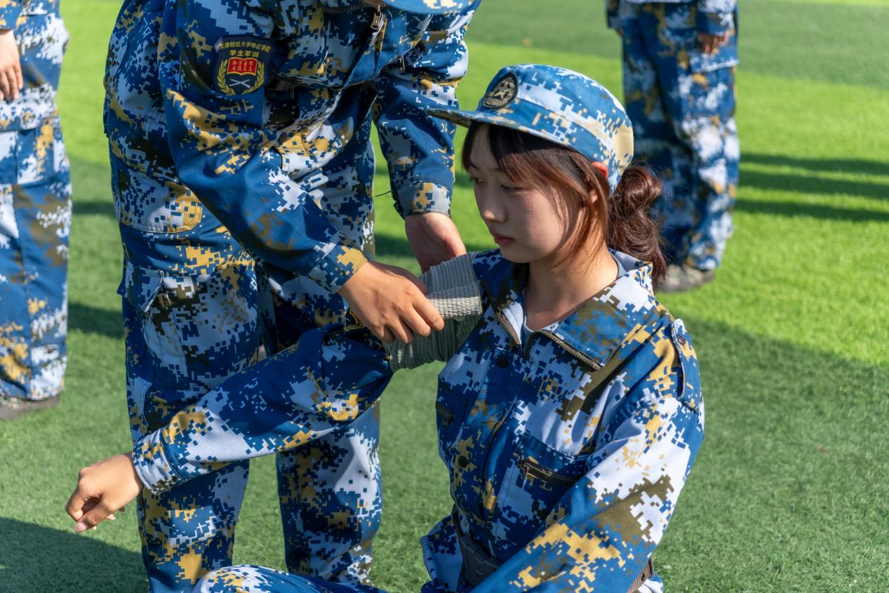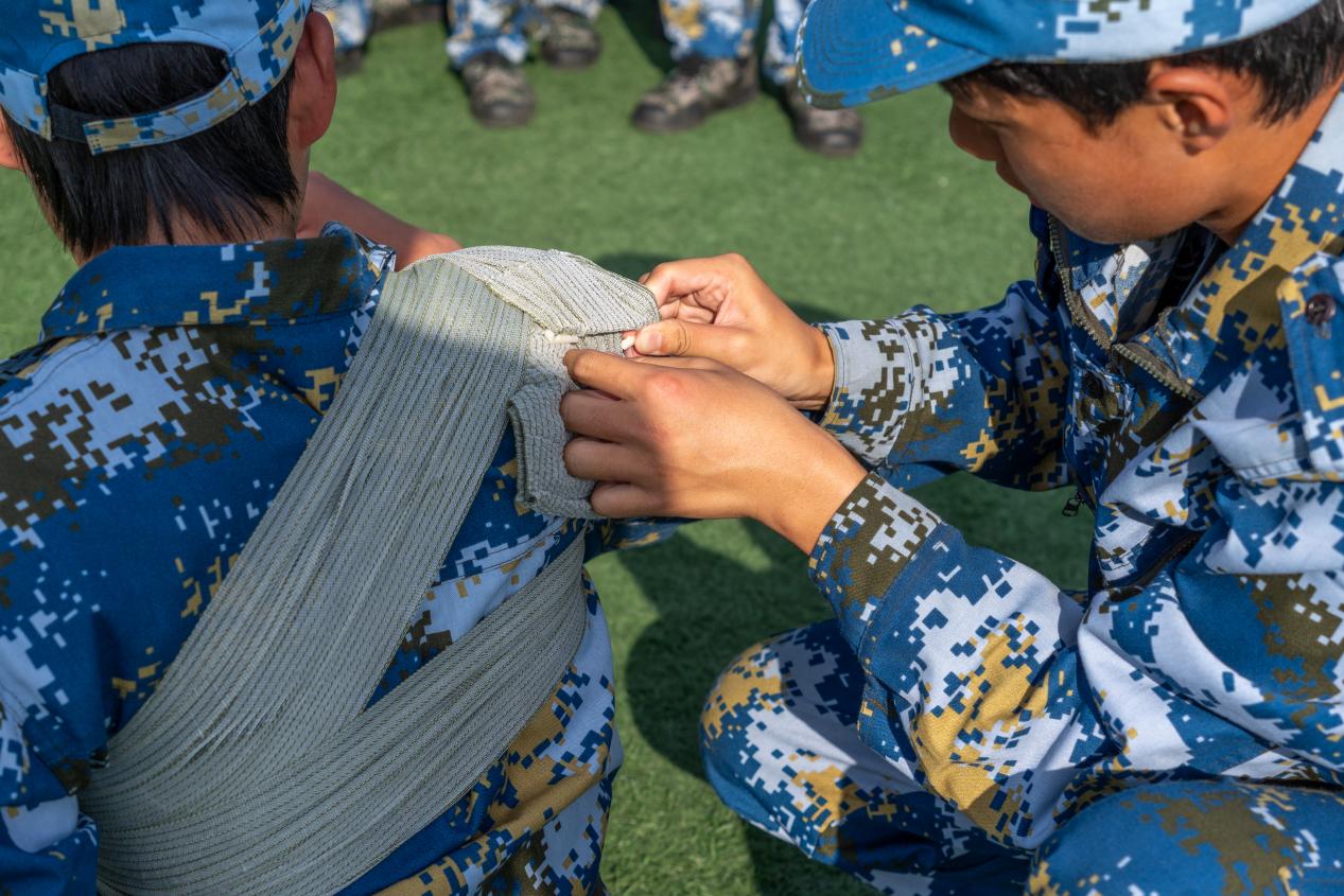 战场医疗科目中,同学们化身“战地医护兵”:抬送担架,四人协同如一人,步履稳健疾行转运“伤员”;包扎伤口,争分夺秒却有条不紊,指尖翻飞间,绷带化为守护生命的坚实屏障。规范的操作是“行医之志”的初体验,让医者仁心的种子在实践中悄然萌发。