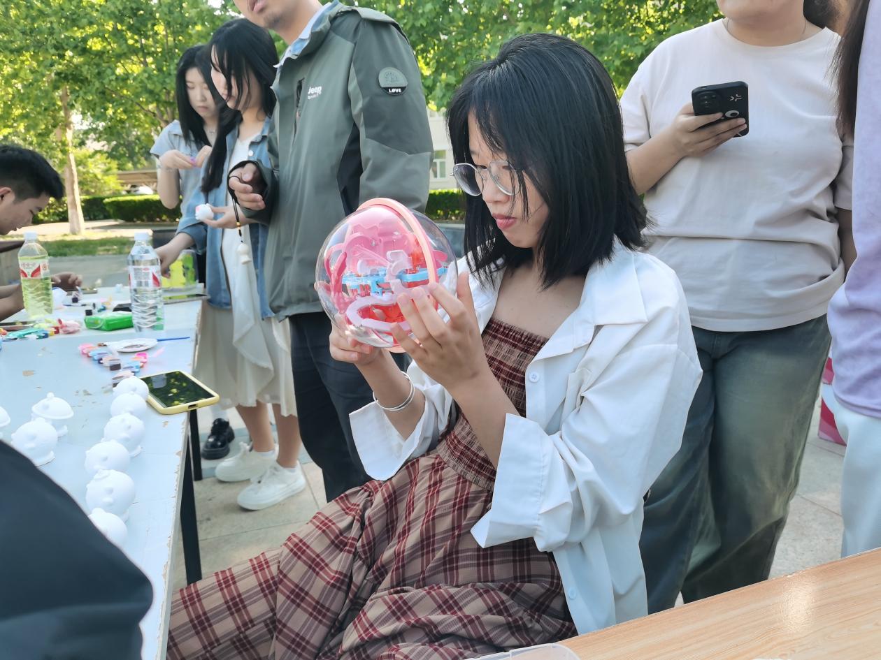 “立体数字迷宫”活动吸引众多学生驻足。参与者手持透明迷宫盒,通过倾斜、旋转操控彩色通道,引导小球按数字顺序穿越层层关卡。迷宫融合空间逻辑与手眼协调训练,挑战中激发专注力与抗压能力。成功通关者可抽取“心灵盲袋”,内含解压玩具、励志书签等惊喜,现场欢声不断。
