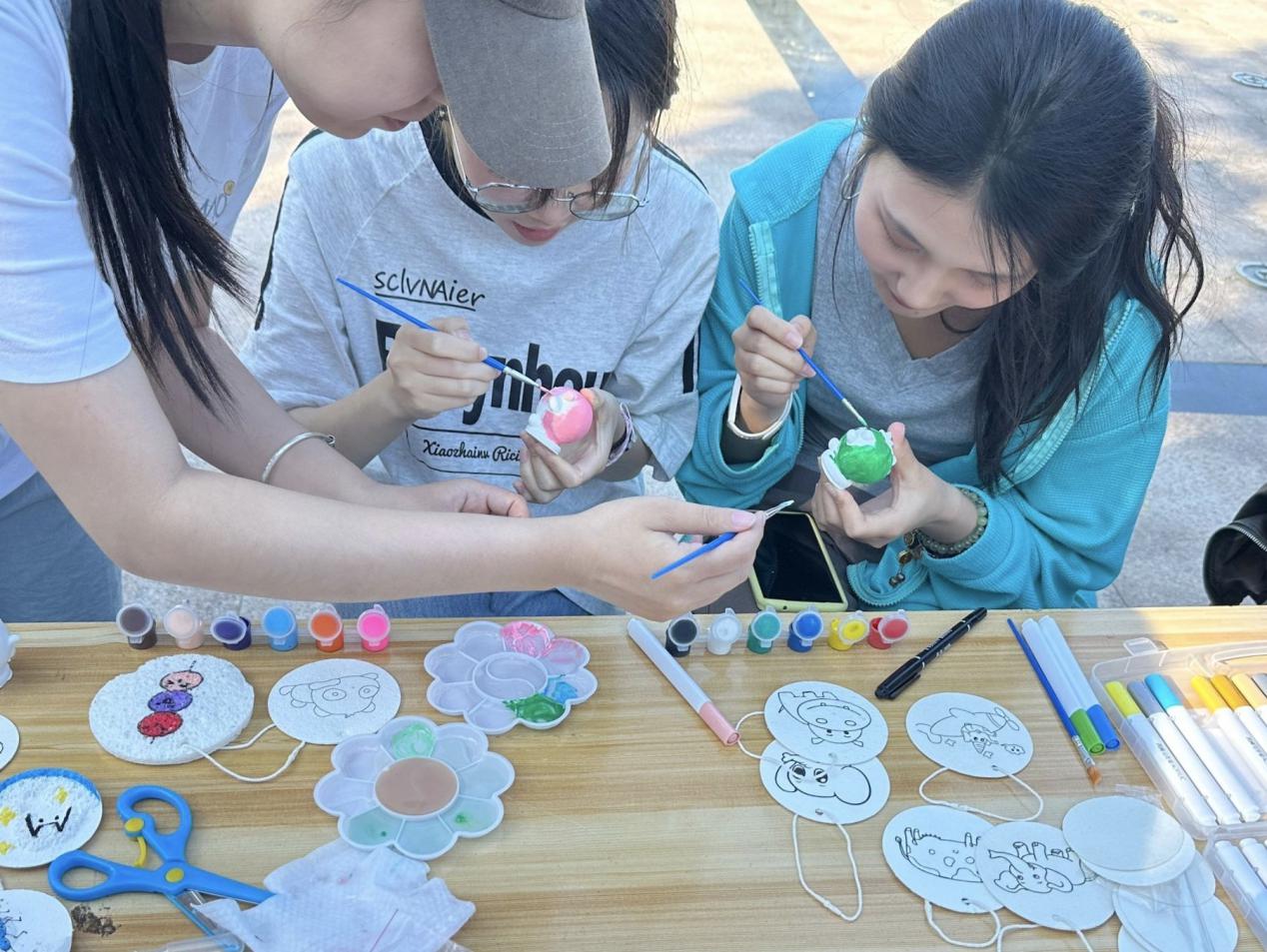 石膏娃娃涂鸦与肌理画创作区域人气爆棚,五颜六色的颜料盘和造型各异的石膏模型瞬间点燃学生的艺术热情。参与者或低头专注地为石膏玩偶披上梦幻外衣,或用画笔和水滴在肌理画布上勾勒出海浪与星空的纹理,将抽象情绪转化为具象色彩。