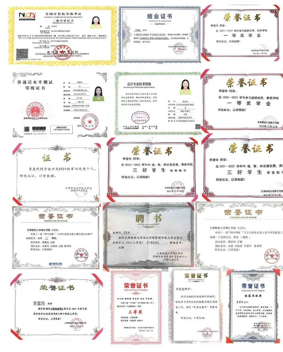 在课程学习之余,李爱玲同学注重将专业知识与实践相结合。她积极参加各类学科竞赛,勇于挑战自我,与团队成员紧密合作,取得了优异的成绩。她曾荣获第十一届“网中网杯”大学生财务决策大赛全国总决赛二等奖和第三届“立信杯”会计技能大赛三等奖,这些荣誉见证了她的努力和成长。同时,她还积极考取各类证书,包括初级会计证、英语六级证、计算机二级证以及普通话等级证书等,为未来的职业发展奠定了坚实的基础。