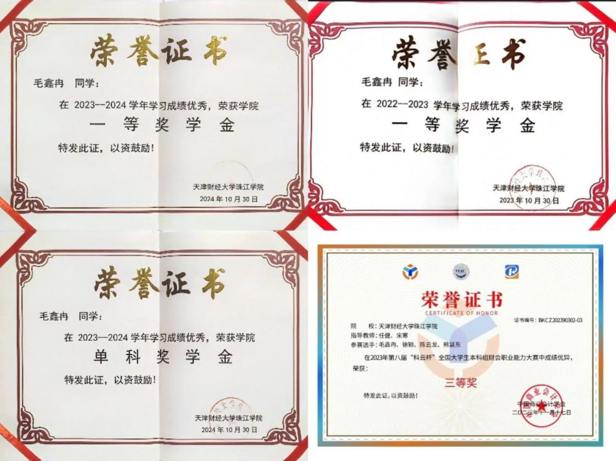 毛鑫冉自入学以来始终以知行合一为行动准则,在学业发展与服务实践中实现双向成长。她连续两年蝉联学院一等奖学金,并考取初级会计职称、计算机二级等多项专业认证,构建起扎实的知识框架。在担任班级生活委员期间,她了解同学需求解决同学生活难题;作为会计学院二课中心主席坚持举办活动助力学风建设;担任新生班主任助理期间积极帮助新生解决问题,在任职期间展现出她卓越的组织服务能力。