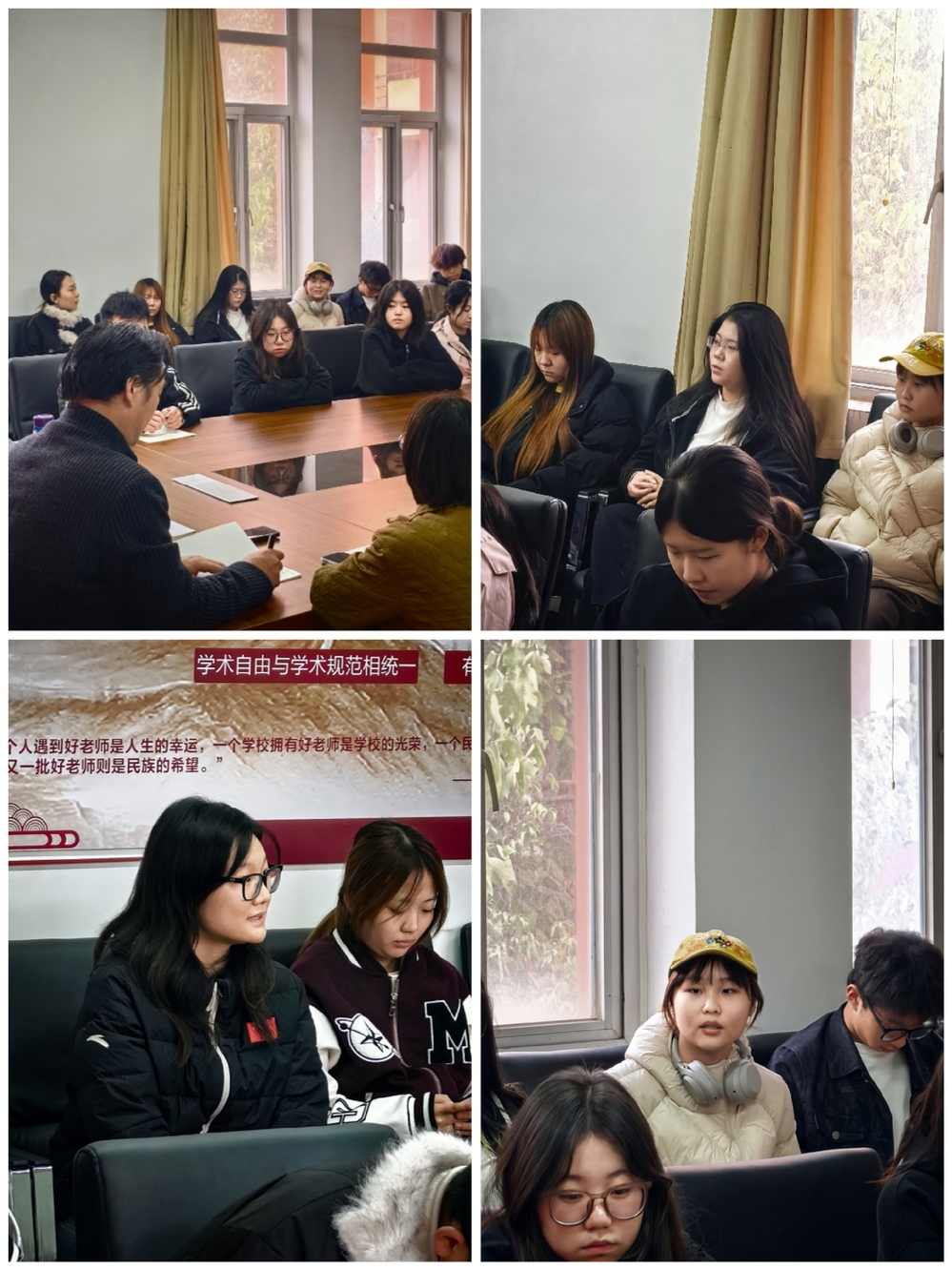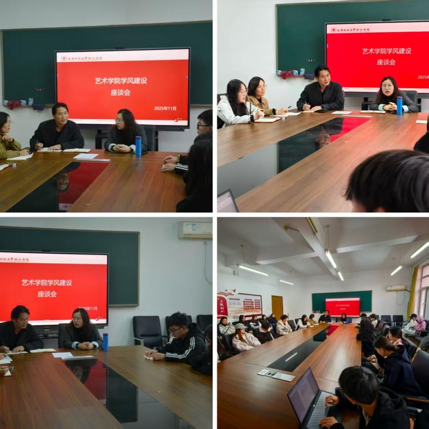为切实加强学风建设,精准回应学生学习诉求,凝聚育人合力,艺术学院于2025年11月4日在老上善A209召开学风建设座谈会。艺术学院院长滑寒冰、党总支书记翟文、办公室主任苏飞飞、辅导员张国繁及各班学习委员共同参会,围绕班级学习现状、成长发展需求等话题开展深入交流。