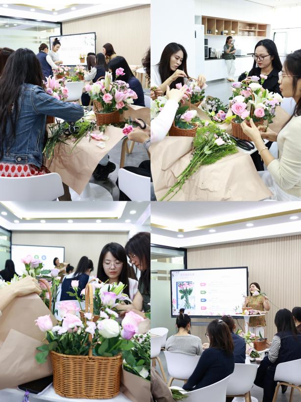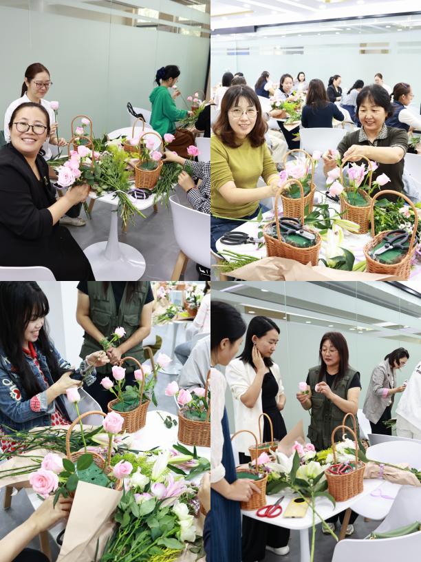 在轻松愉快的氛围中,教职工们表现出了极大的热情与创造力。大家纷纷拿起面前琳琅满目的花材,结合个人的审美巧思,动手创作属于自己的花艺作品。玫瑰的娇艳、百合的清香、康乃馨的温馨,再配以绿植的点缀,一篮篮错落有致、独具匠心的插花作品逐渐成型。讲师与助教穿插指导,教职工们相互交流借鉴,现场其乐融融。