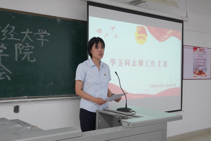 会上,毕玉做会计学院团委工作汇报。毕玉全面总结了会计学院前身——管理学院会计学系,在管理学院团委的带领下所取得的成绩和积累的经验;并指出会计学院团委将延续脚踏实地,真抓实干,求真务实的工作作风,进一步提高会计学院团委的目标和工作要求;另表示会计学院团委将与其他二级学院团委,协同合作,共同面对未来的各项挑战,一起推动学院事业的发展。