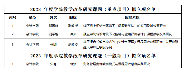 2023年8月31日,根据《天津财经大学珠江学教学改革研究课题管理办法》,学院 2023 年度教学改革研究课题的申报、评审工作已结束。经校外专家评审,会计学院共四项项目批准立项。具体如下: