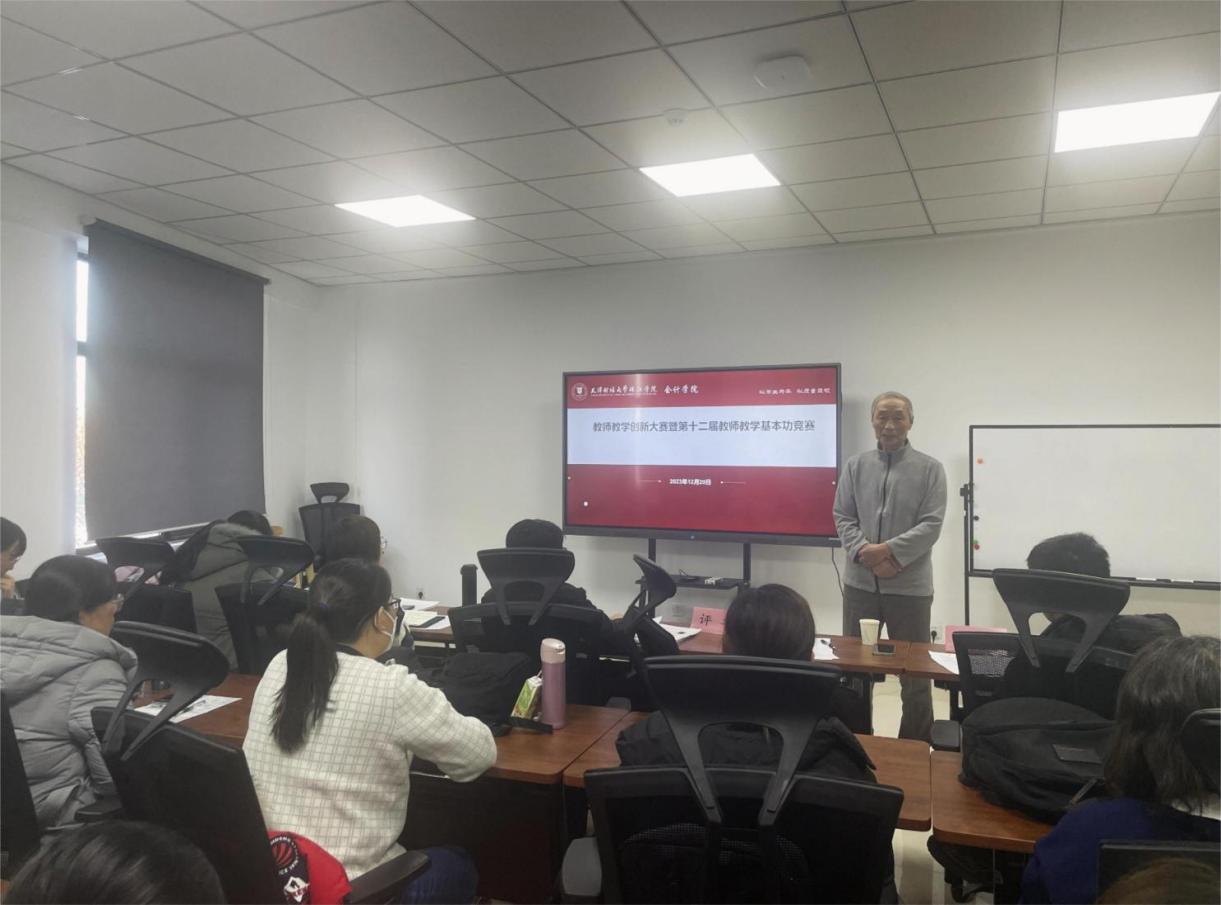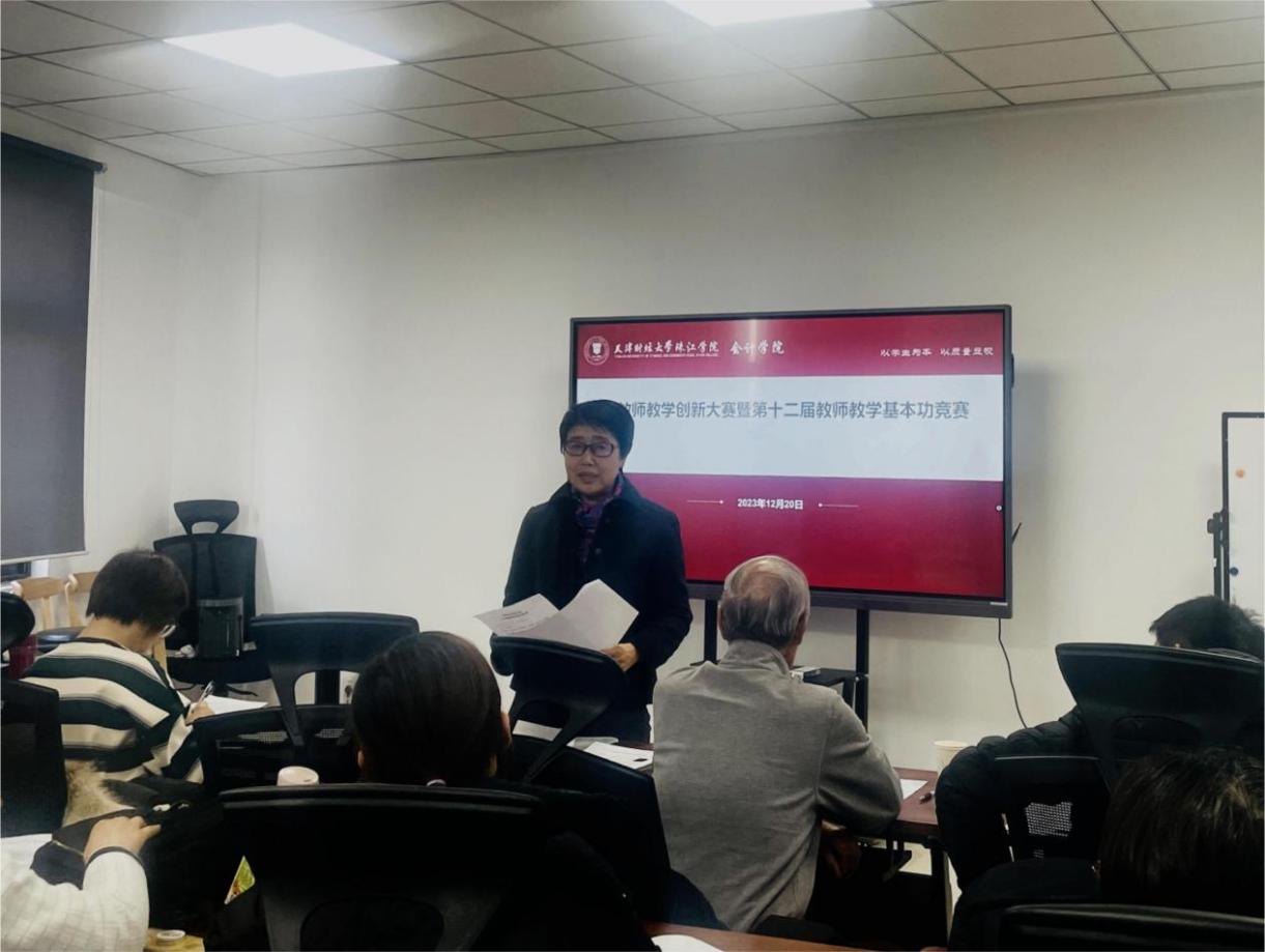 为提高教师的教学水平,激发教育创新活力,12月20日下午,会计学院徐立文老师的名师工作室组织全体教师开展教学创新大练兵活动。经过初选,本次练兵活动推选了12名教师上台比拼,邀请了教学督导专家杨尊琦、赵秀云教授,以及会计学院院长韩传模作为评委专家进行指导。比赛由会计学院办公室主任杨璐主持。