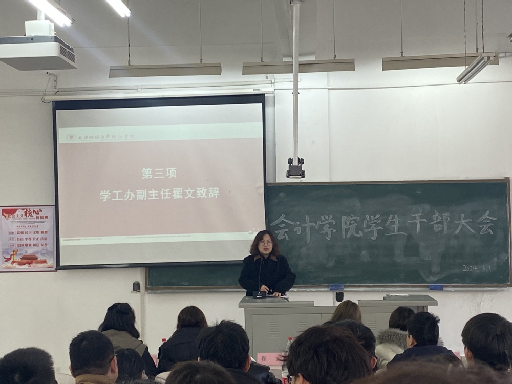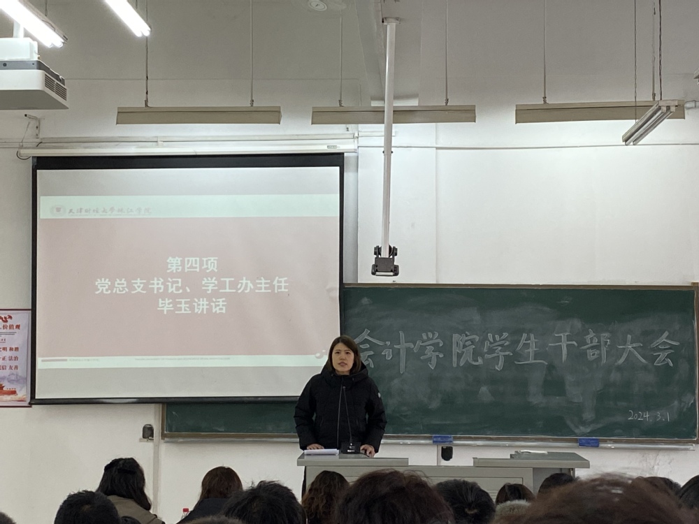 为进一步加强学生干部队伍建设,切实提升学生干部的工作能力和服务水平,更好发挥学生干部的带头作用,会计学院学工办于3月1日下午在日益楼召开2024年新学期学生干部大会。会计学院党总支书记、学工办主任毕玉、学工办副主任翟文、专职辅导员及主要学生干部出席会议,会议由学生会秘书处干事马晓璇主持。